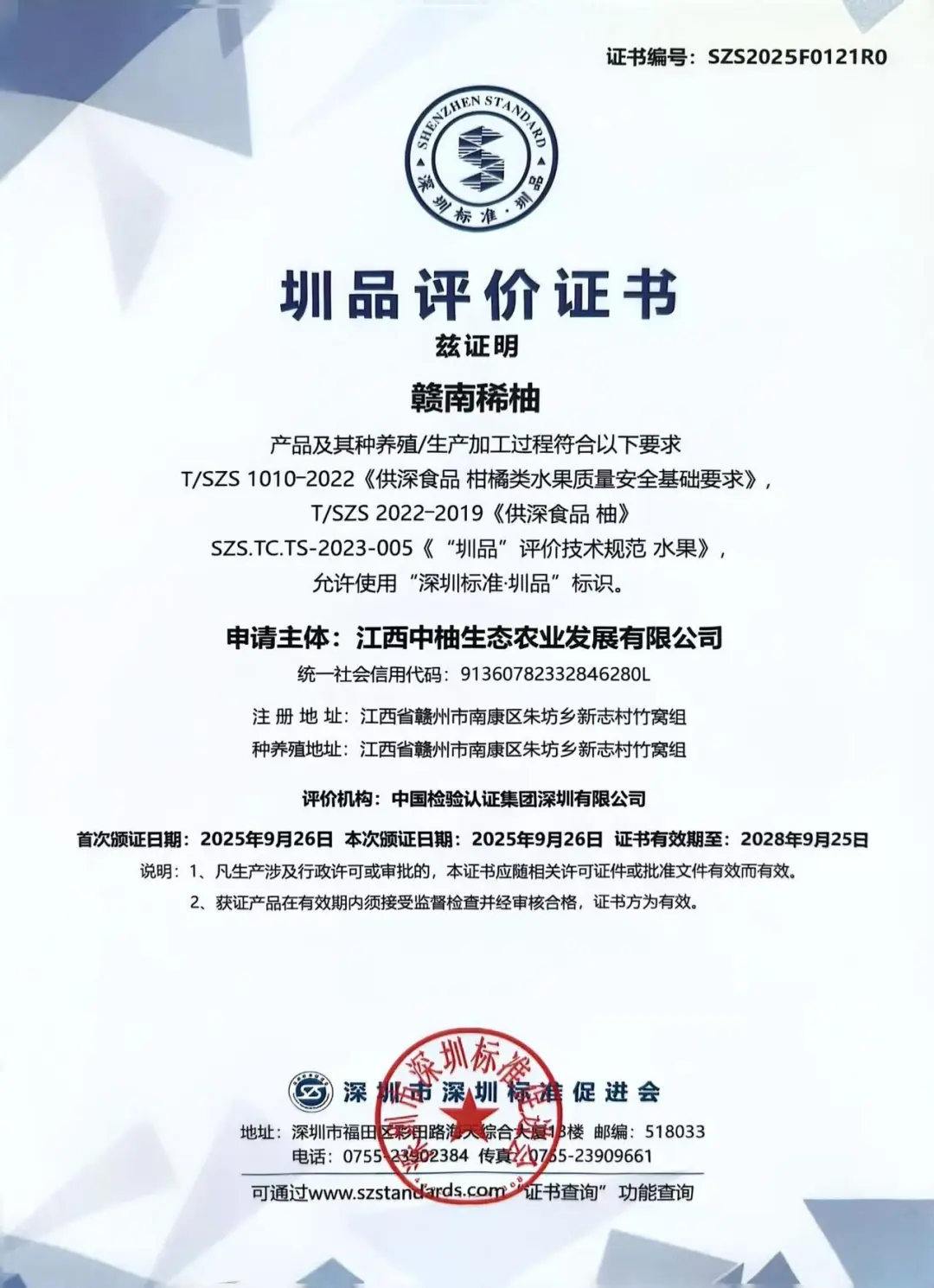 跨界联名的创新突破 2024年10月,江西中柚携央视播出动画《天才小鲁班》IP授权联名礼盒,亮相第十七届亚洲果蔬展,通过传统文化IP与现代农产品的创新融合,使品牌辨识度与溢价能力显著提升。 联农带农的产业担当 作为赣州市农业龙头企业,江西中柚通过”公司+合作社+农户”模式,定期为周边果农提供技术培训,带动农民共同致富,实现了经济效益与社会效益的双赢。 此次赣南稀柚产品获得 “圳品” 认定,标志着其在安全标准、品质控制、追溯管理等方面均达到圳品体系要求,不仅为产品拓展更广阔的市场空间提供支撑,也帮助消费者更精准地识别规范化培育的赣州南康柑橘类农产品,进一步推动当地优质农产品品牌形象的提升与传播。 “圳品”是深圳市委、市政府实施食品安全战略,让市民吃得放心的重大成果。“圳品”对标国际最高标准,形成国内领先体系,体现“高于国标对标一流”的要求,从产品质量检测、环境检测、企业体系管理、产品溯源、基地规模五个方面,从基地到餐桌全链条进行安全和质量把控。从审核、评价到推出,从农田、商超到餐桌,“圳品”都有对应的高标准作为依据,并通过对食品“全链式”标准化管理,深化从产地源头到市场终端的标准衔接。 未来,深圳将持续推进“圳品”工程建设,持续拓展合作网络,深化与赣州等优质农产品产区的联动,助力更多像江西中柚生态农业发展有限公司这样的企业通过“圳品”走出区域、走向全国。